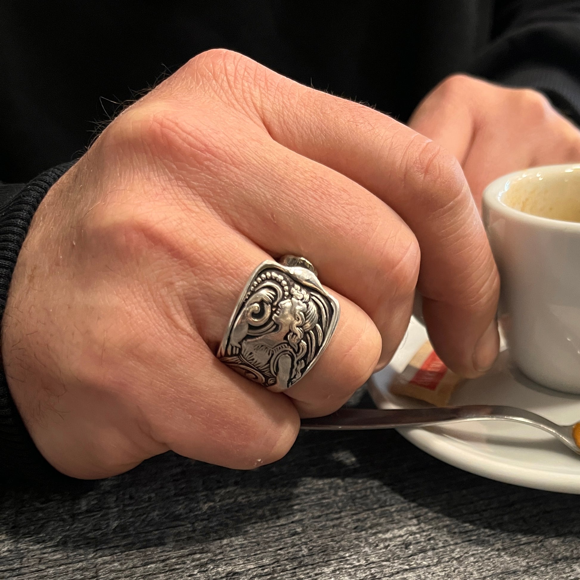 La ninfa eterea con fluenti capelli e vesti mosse dal vento, sbalzata su manico sinuoso tra volute floreali, lo rende un pezzo unico raro e da collezione ambito da appassionate di anelli vintage.