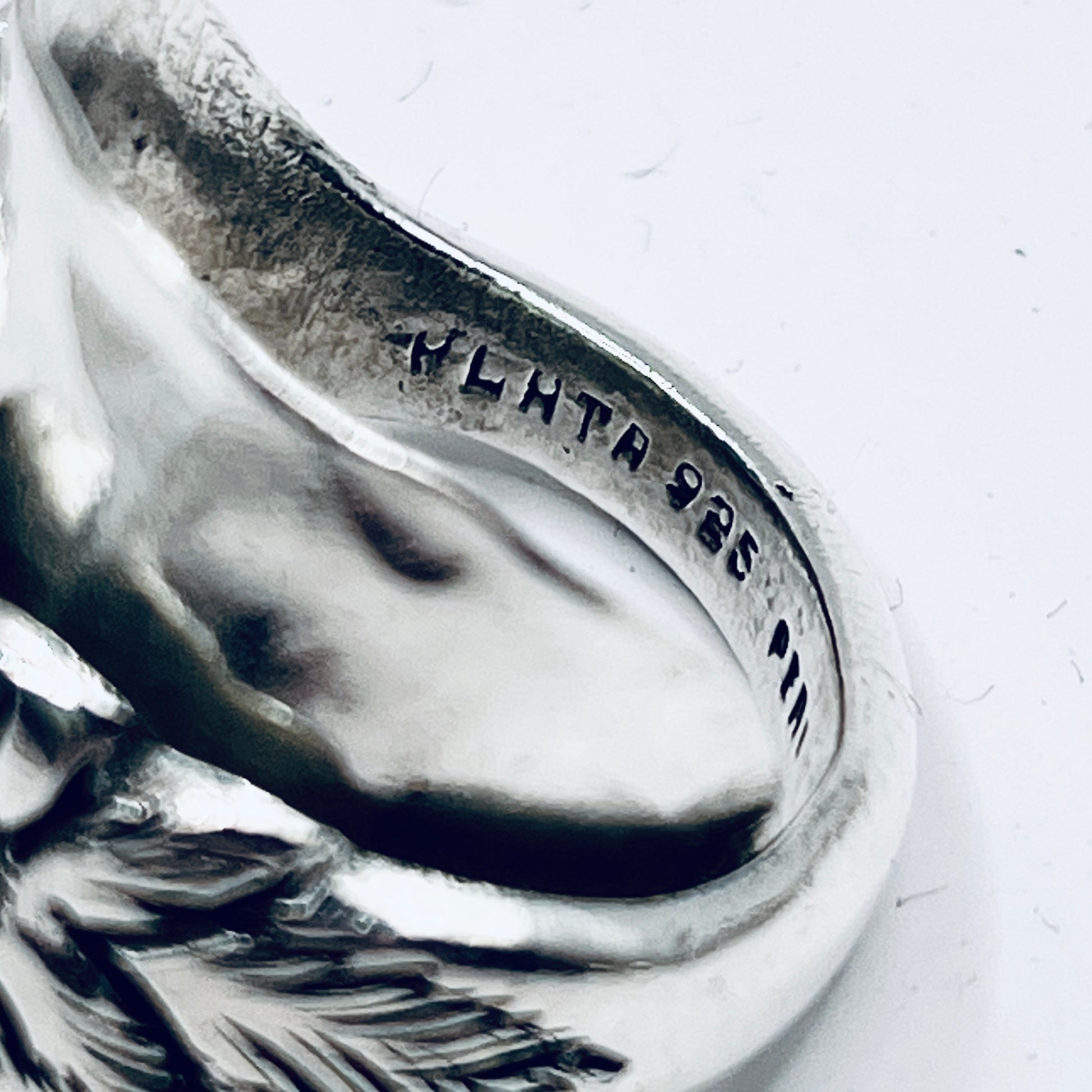 La superficie martellata del resto della fascia è lucidata a specchio e fa da contrasto al decoro scuro e dettagliato, per un pezzo unico che mantiene visibile il legame con il cucchiaino da cui nasce, perfetto come anello statement artigianale.