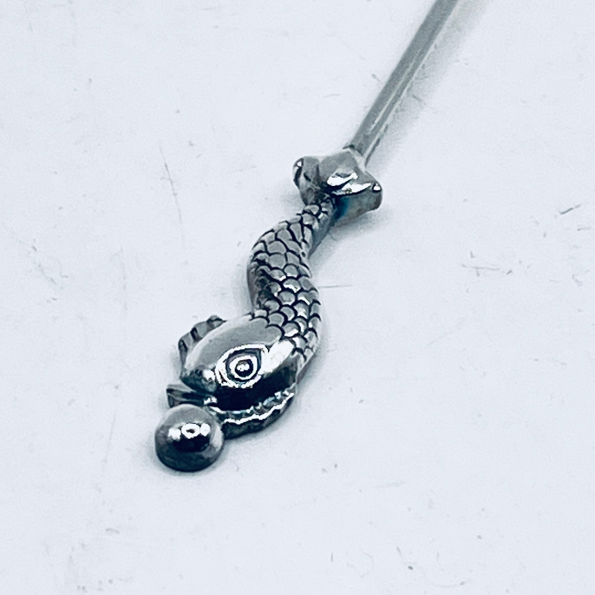 Il manico è decorato da un elegante delfino araldico, con il corpo sinuoso e le squame incise, che sembra soffiare una piccola sfera d’acqua: un chiaro richiamo alle antiche fontane ornamentali.