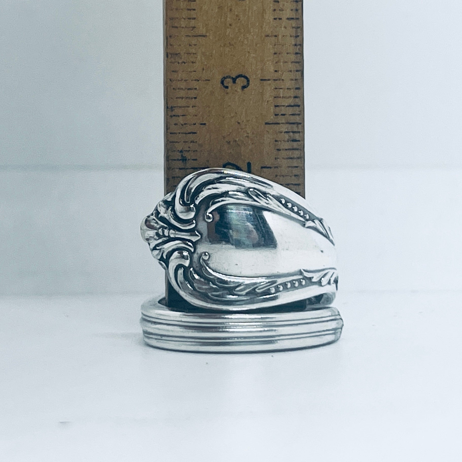 Scopri l’eleganza senza tempo di questo anello unico creato artigianalmente utilizzando il manico di un antico cucchiaino in lega d’argento risalente alla prima metà del Novecento.