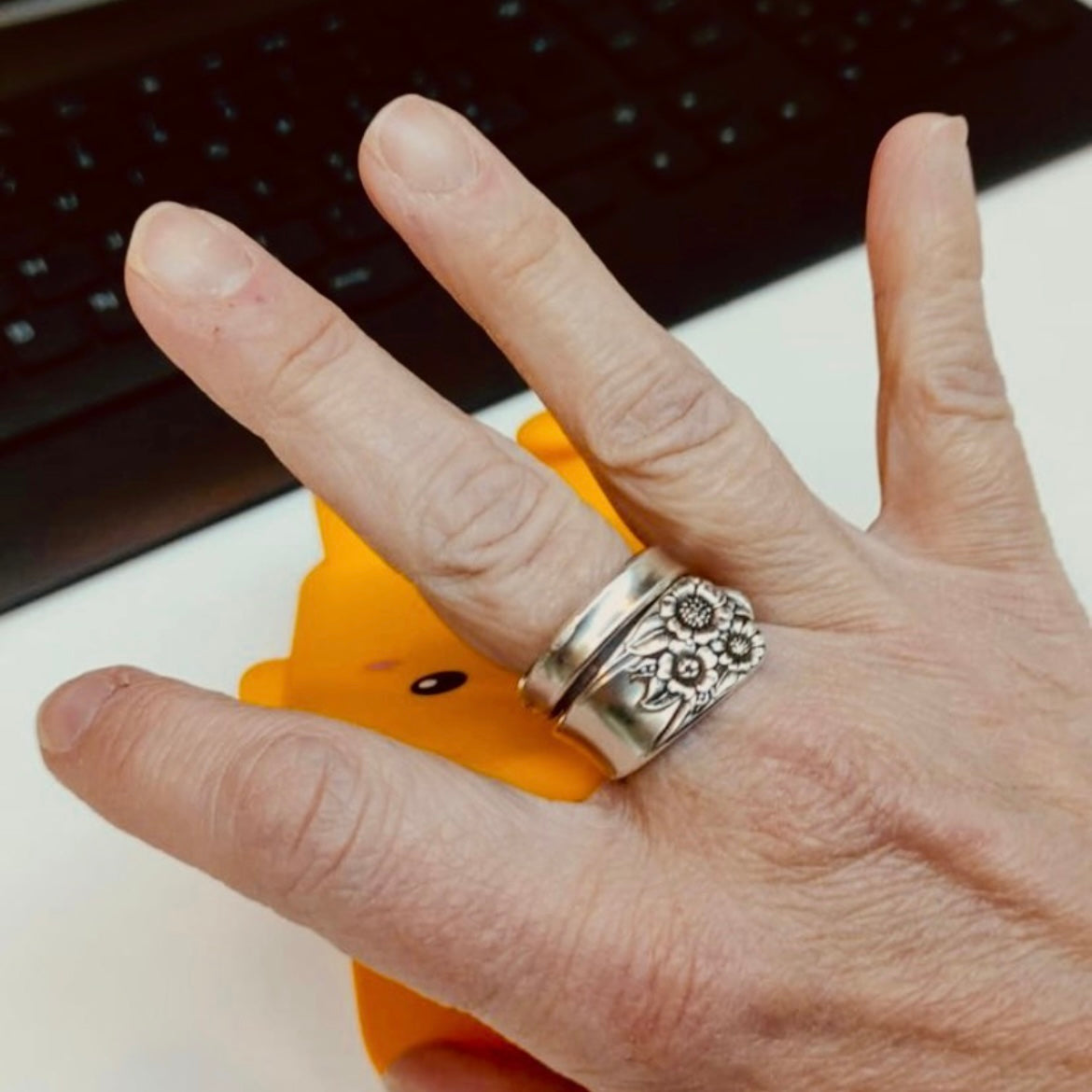 Scopri l’eleganza senza tempo di questo anello unico creato artigianalmente utilizzando il manico di un antico cucchiaino in lega d’argento risalente alla prima metà del Novecento con tre bellissimi GIRASOLI 🌻