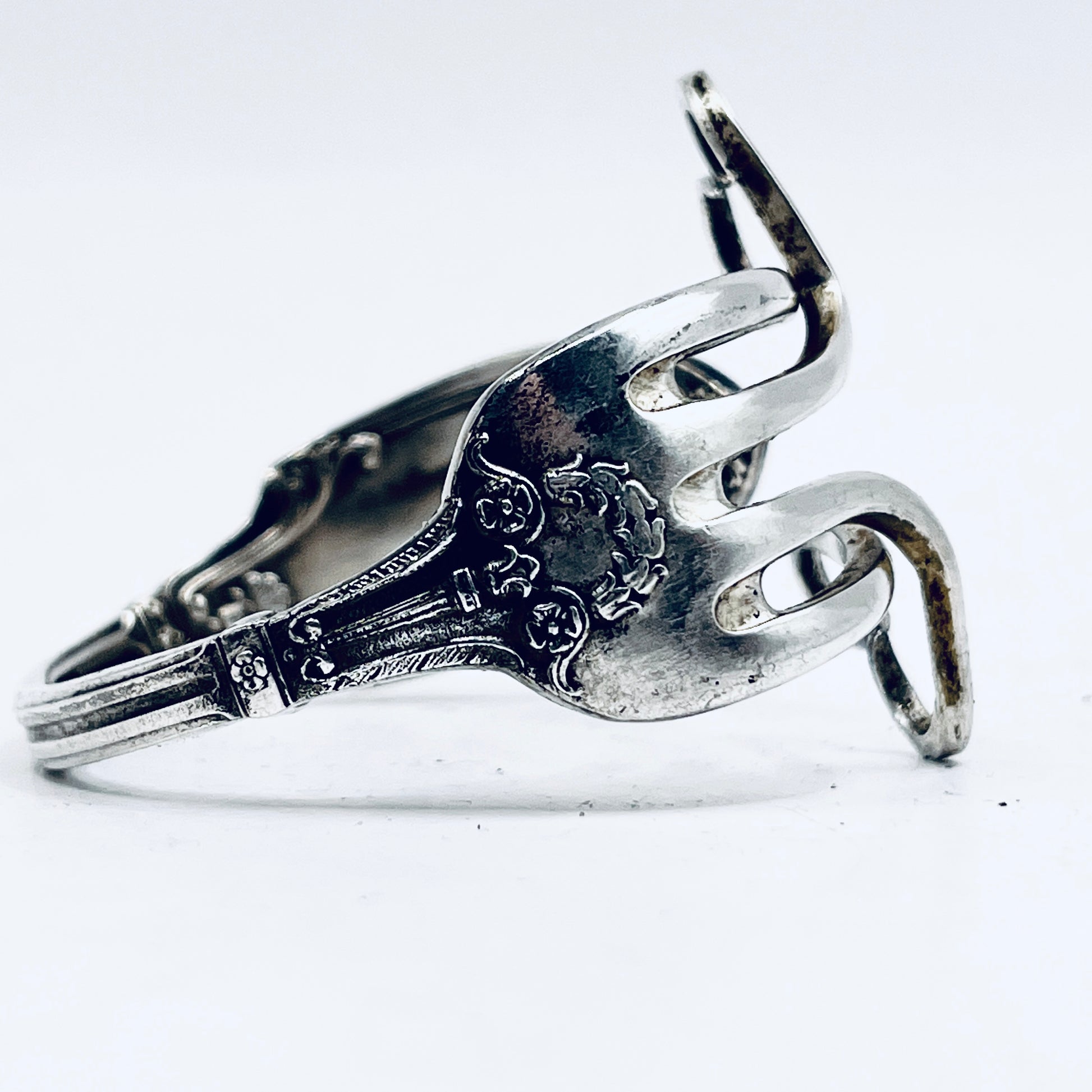 Scopri l’eleganza senza tempo di questo bracciale unico creato artigianalmente utilizzando un’antica forchetta in lega d’argento, della prima metà del 900
